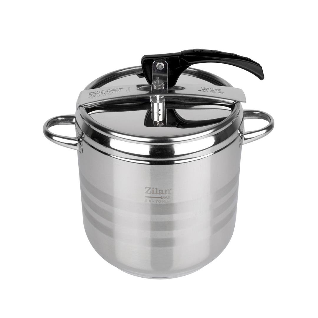 • Capacity: 9 L • Min: 0,55 / Max: 1,10 bar • Stainless steel body and lid • Triple capsule bottom • Shiny and meticulously polished external surface • Ergonomically designed handle and lid • Suitable for use on all cooktops including induction