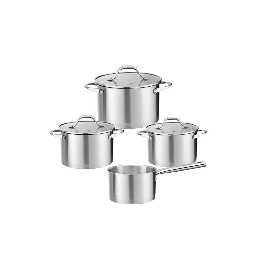 • Saucepan 16x9.5cm without lid • Casserole 16x9.5cm with lid • Cocotte 20x12.5cm with lid • Cocotte 24x14.5cm with lid • Comfortable handle • Adjustable ladder on inside wall • Thermo-stable bottom conducts heat quickly and evenly multi-layer body and base in 18/10 stainless steel • Multi-layer body and bottom in top-quality 18/10 (SS304) with an aluminum core • Can be used on all types of hob, including induction • Tempered glass lid with steam outlet • Dishwasher-safe