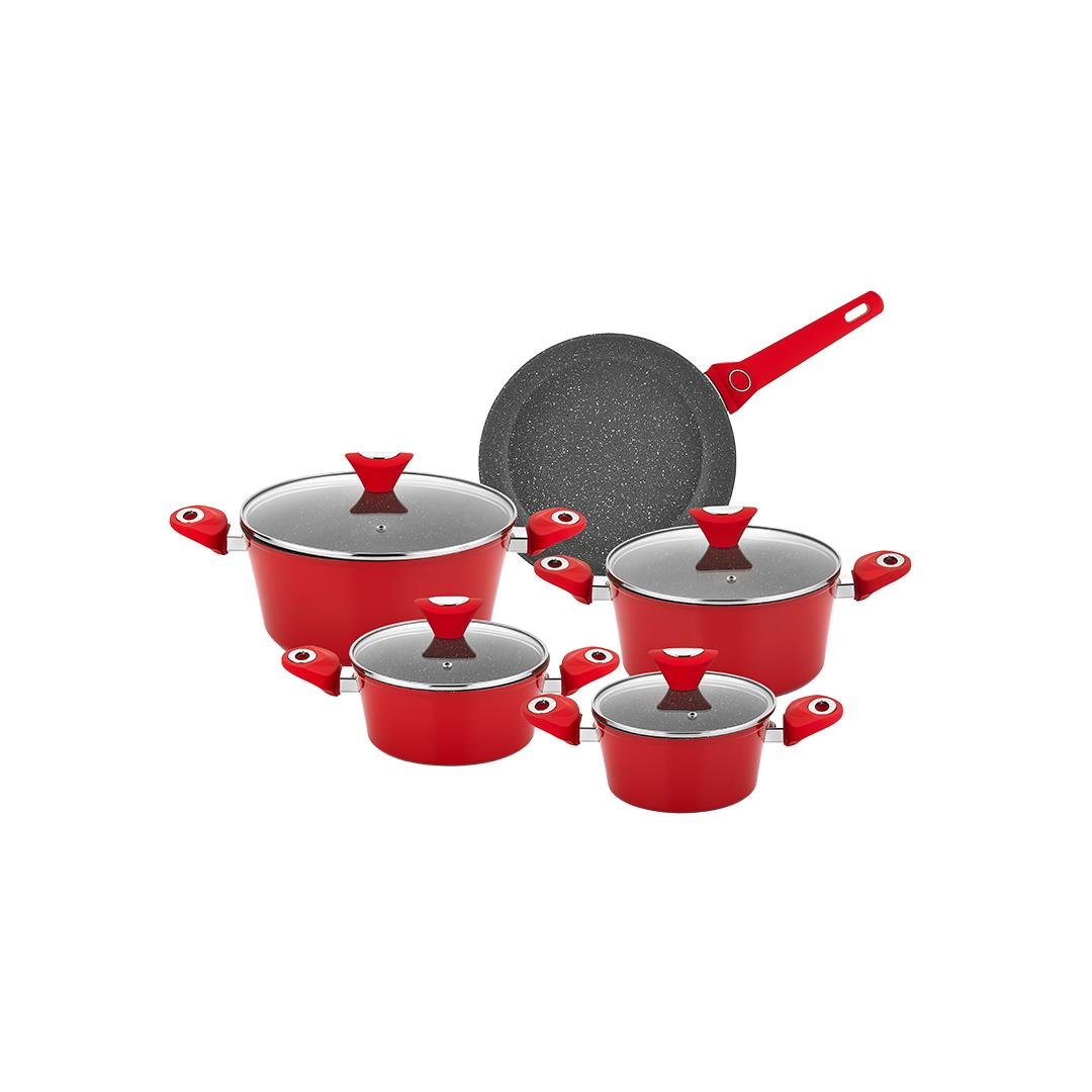 • 100% aluminum body • Interior coating: non-stick rough marble • Exterior coating: heat-resistant PTFE with red paint • Hole induction base • Casseroles with glass lids • Handle: soft-touch grip • Easy-to-clean glass covers • Coated with EcoSafe technology • Specially designed • Sizes: 18–20–24–28 cm casseroles + 26 cm frypan