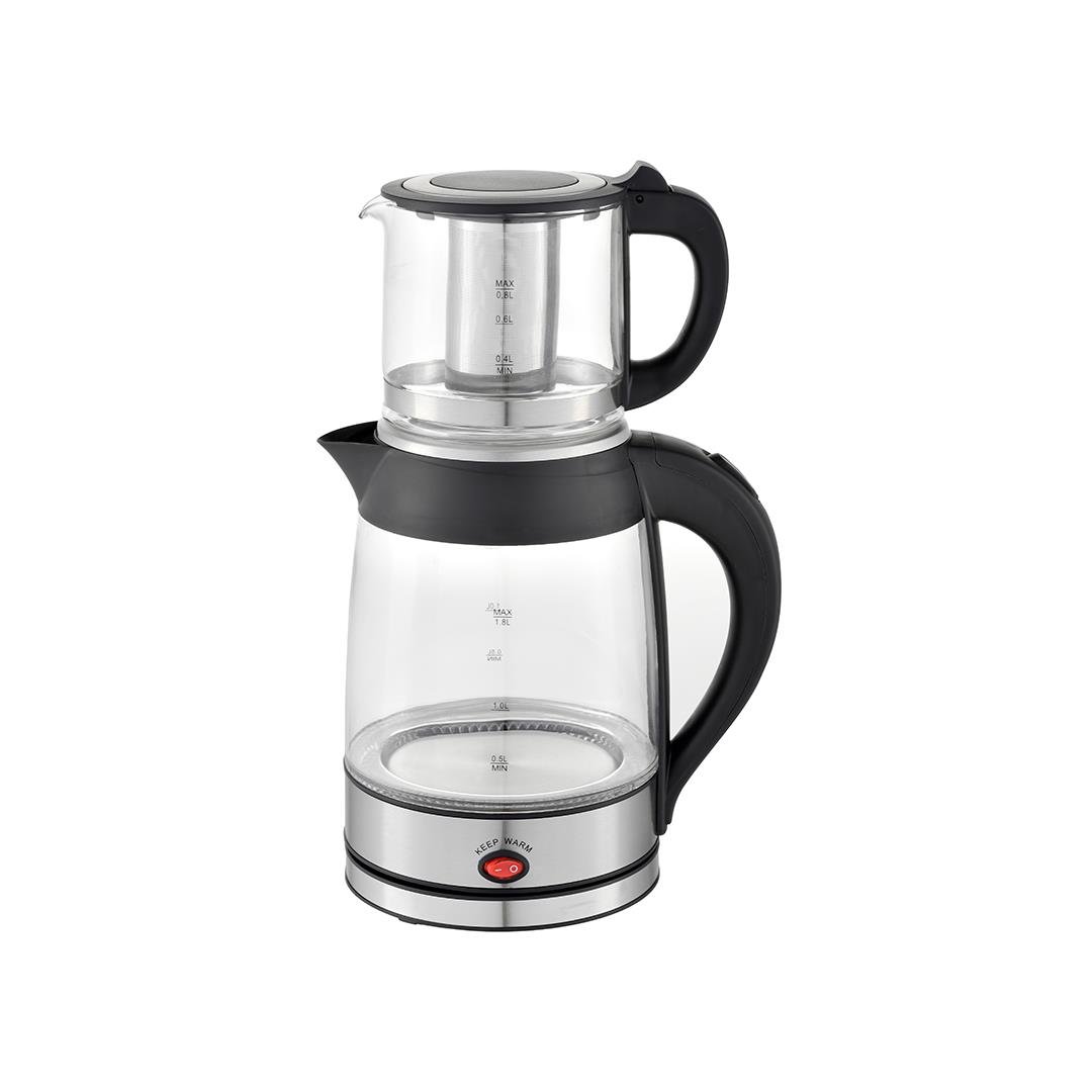 • Kettle capacity: 1.8 L • Tea pot capacity: 0.8 L • High borosilicate glass body • Stainless steel concealed heating element • Boil-dry protection • Overheat protection • Keep warm function • Automatically turns off when water boils • Cleanable and removable stainless-steel filter • Blue LED light • Cordless kettle with 360° rotational base • Detachable power base • Extra kettle lid • 220-240V~ 50-60Hz 1850-2200W